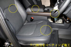 ボディコーテンングと同様に、シート(革・合皮、ファブリックなど)にコーティングを行う事で汚れ・キズなどを防ぎ、長期間美しい状態を維持しやすくなります。
