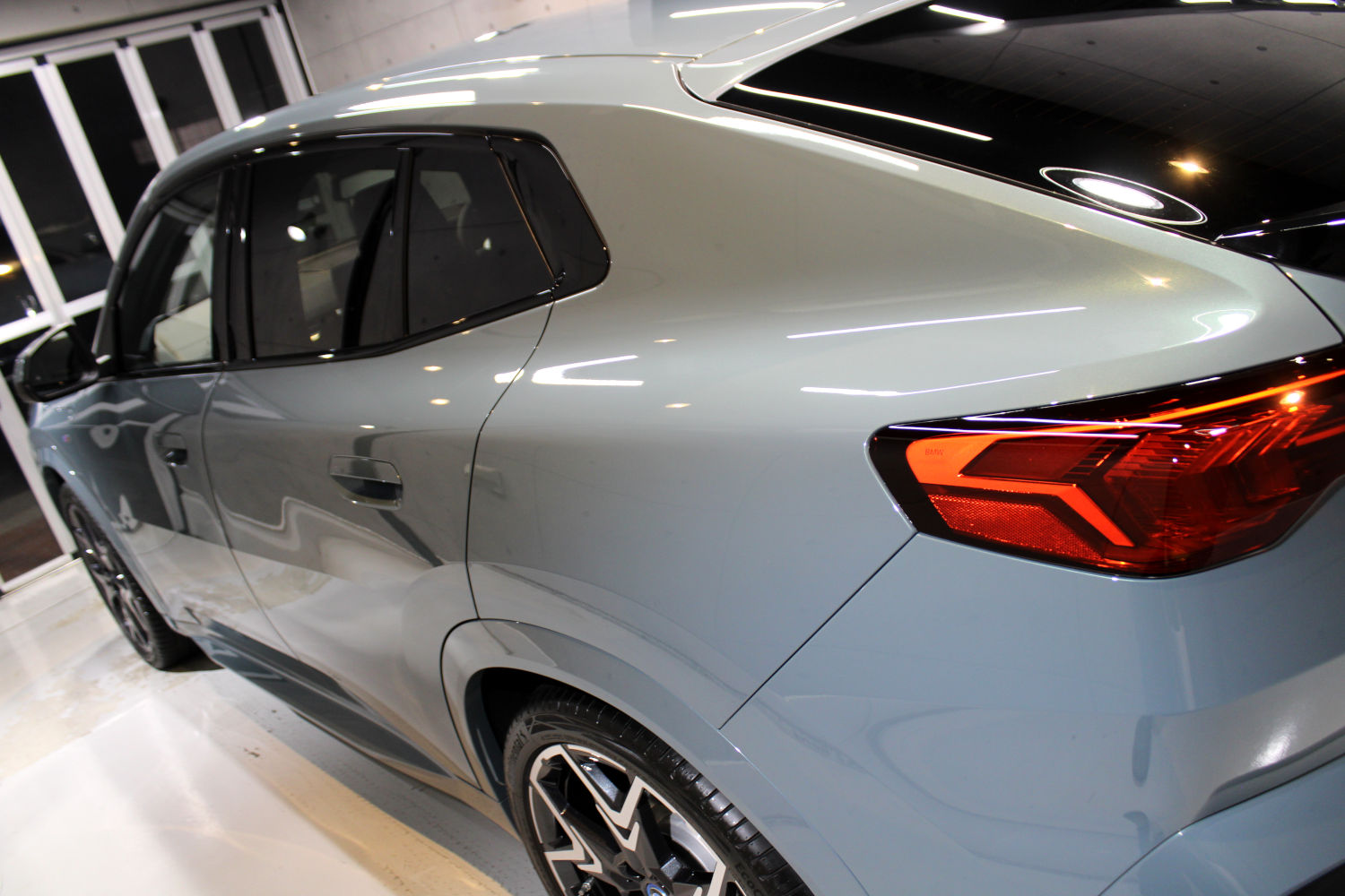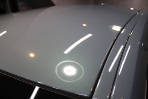 次にコーティング剤を塗布します。セラミックを主成分とした当グループ最高級の【リボルトプロ・エクストリーム】は膜厚も増してより深い濡れたような美しい艶を演出してくれます。耐スリ傷、撥水性能、汚れ軽減の性能も向上しており、ボディ保護力が増しました。触り心地のスベスベ感が最も分かりやすい特徴で、車に乗るとき、ドアを触るたびに実感して頂けると思います。そして、滑りが良くなっている分、汚れも落としやすくなっているのです。