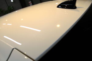 次にコーティング剤を塗布します。セラミックを主成分とした当グループ最高級の【リボルトプロ・エクストリーム】は膜厚も増してより深い濡れたような美しい艶を演出してくれます。耐スリ傷、撥水性能、汚れ軽減の性能も向上しており、ボディ保護力が増しました。触り心地のスベスベ感が最も分かりやすい特徴で、車に乗るとき、ドアを触るたびに実感して頂けると思います。そして、滑りが良くなっている分、汚れも落としやすくなっているのです。
